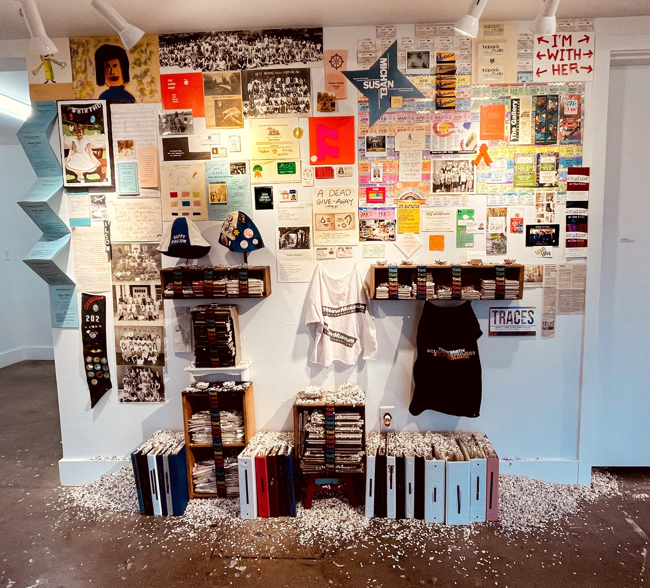Memory Project: Timeline was a visual compilation of ephemera from the experiences of my life. The saved and catalogued material includes feeding instructions from days after I was born, group photos from camp and other experiences, brochures, ID cards, business cards, exhibition cards etc. Bundled stacks of notebooks, journals, autograph books and chronological binders, are strewn with shredded bits that have been discarded and destroyed, leading the way to my ultimate letting go of it all.